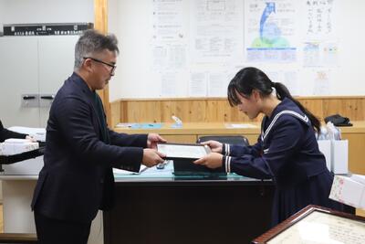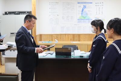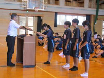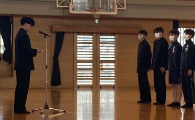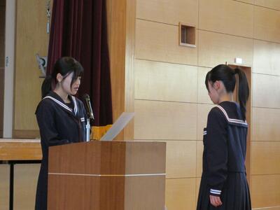 昨日(12月1日)、先日選挙で当選した生徒会の新三役に校長先生から任命書が渡されました。また、これまで生徒会をリードしてきた旧三役に、新三役から感謝状が渡されました。