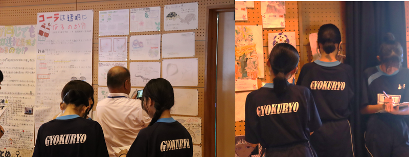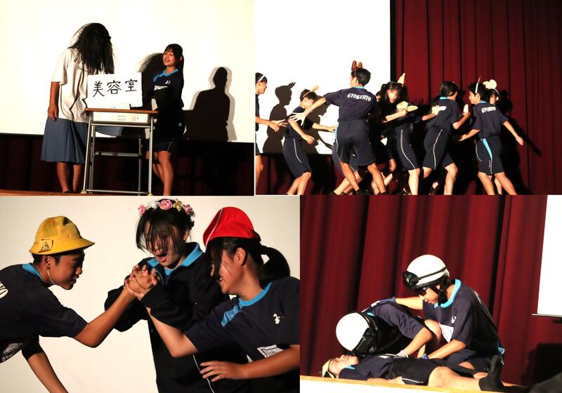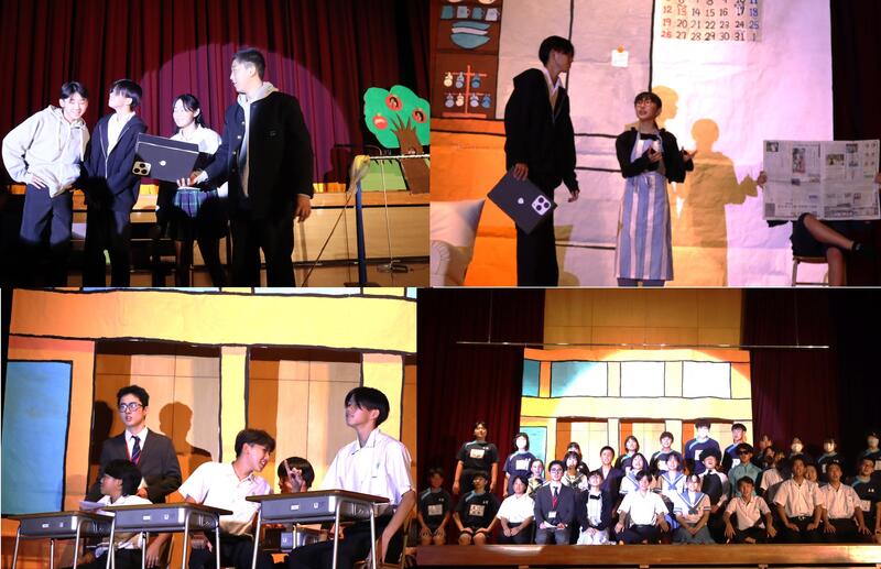 午前は、生徒会のオープニングから始まり、音楽部の演奏、狂言、各学年の発表がありました。体育館の中には各教科や総合的な学習の時間、美術部や委員会の展示がありました。