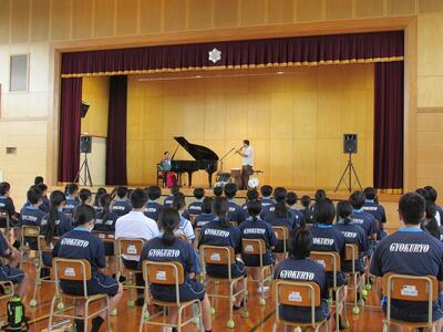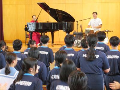今日(10月20日)、玉名市音楽アウトリーチ事業として「音の和music」の藤川さん夫妻に来ていただいて、スクールコンサートをしていただきました。
