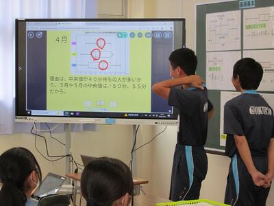内容は、「箱ひげ図のデータの分布の傾向を比較して読み取り、判断して説明する。」というもので、生徒たちはタブレットを活用しながら、自分の考えを書き、意見交換などをして考えを深め、ほかの人に自分の考えを説明していました。