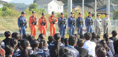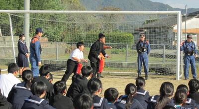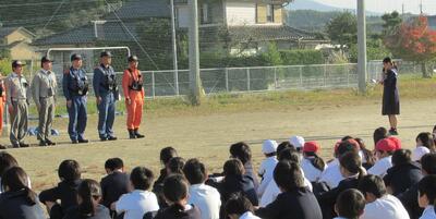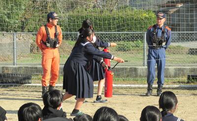 避難後、校長先生の講評、消防署の方からのお話、消火訓練などを行いました。