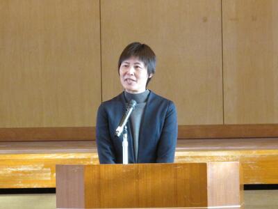 校長先生の話の後、新しい事務の山形先生から着任の挨拶がありました。