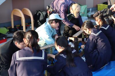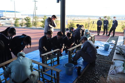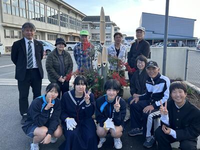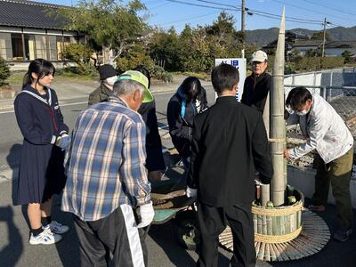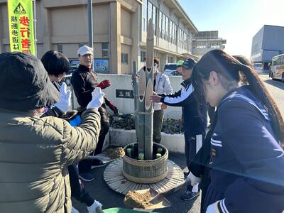 新生徒会三役は12月19日(金)に、学校運営協議会の方々と、校門に飾る門松を作成しました。