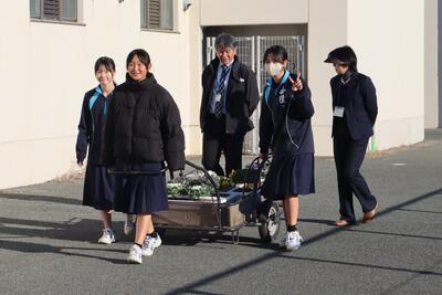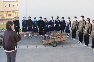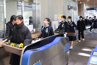 先週の金曜日(12月5日)フラワープロジェクトとして、学校運営協議会の方々と一緒に小中合同でプランターに植えた花を、新玉名駅に飾りに行きました。