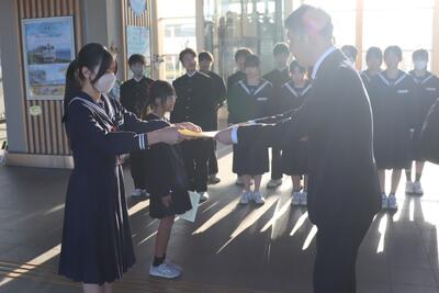 昨日(12月1日)、先日選挙で当選した生徒会の新三役に校長先生から任命書が渡されました。また、これまで生徒会をリードしてきた旧三役に、新三役から感謝状が渡されました。