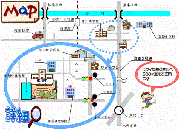 本校は設置者が八代郡氷川町及び八代市で、熊本県唯一の中学校組合立の中学校です。昭和26年1月18日に開校し、昨年度、創立75年を迎えました。八代平野のほぼ中央部、清流氷川の南側を校区とし、校区の中央部を国道3号線が南北に縦断しており、その沿線には商店街が連なっています。校区の西側は米やい草などを栽培する農村地帯、東側には山間部となりますが、氷川沿いには景勝地である立神峡があります。