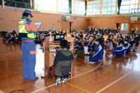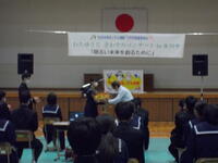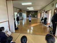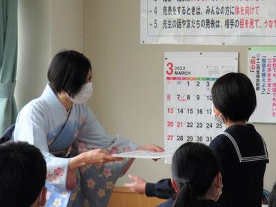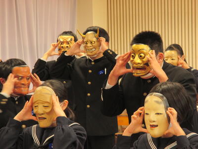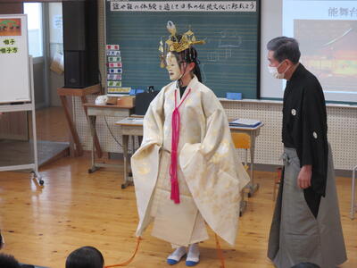 3年生は能楽体験教室を行いました。講師は宮原在住で日本能楽協会金春流シテ方教授の田中寿男先生に来校いただきました。「能楽」についての説明だけでなく、実際に衣装を身にまとったり、人数分の能面を持参いただき一人一人が能面を体験したりするコーナーもありました。