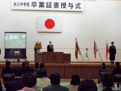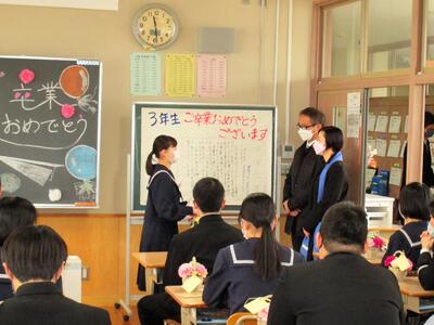 令和3年度第72回卒業式を挙行しました。新型コロナウイルス感染症拡大防止の観点から、卒業生と保護者のみの参加による卒業式となりました。厳粛な中、31名の卒業生は母校を巣立っていきました。最上級生としての3年生の学校生活は言葉で表せないくらい素晴らしいものでした。最後の学活では、担任の吉川先生から一人一人卒業証書の授与、卒業生一人一人が思いをみんなに伝えた後、卒業生からこれまで育てていただいた保護者へ花とメッセージを渡しました。