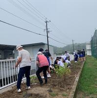 氷川町ソフトテニスクラブ、氷川中CS、学校協働活動、PTA、生徒会が一体となって、あいさつでつなぐアジサイロードを作りました!みなさん、ありがとうございました。