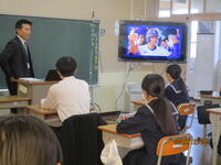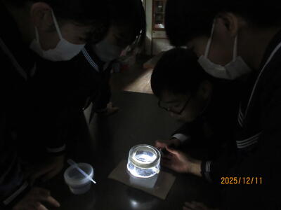 内容は「放射線」についてです。少し難しい内容ですが、わかりやすく丁寧に教えていただきました。室内を暗くして放射線を目視する実験もあり、生徒たちは興味深く取り組んでいました。