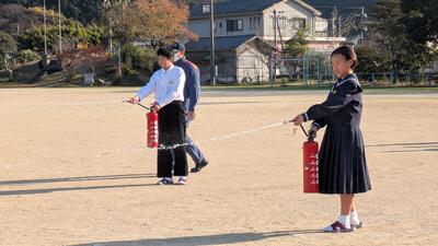 避難後は水消火器を使って消火訓練を実施しています。「火事だ~」と大きな声でみんな叫ぶことができていました。