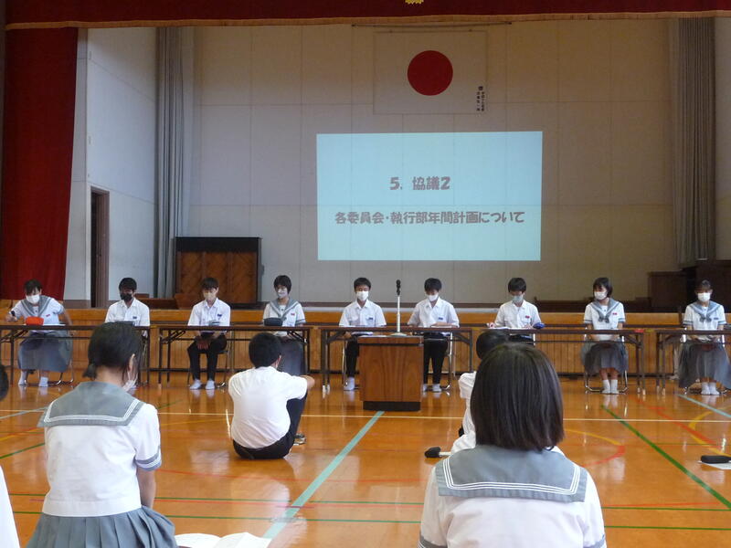 生徒会執行部や専門員会が主となり議題を提案し、それについてみんなで質問や意見を出し合いました。