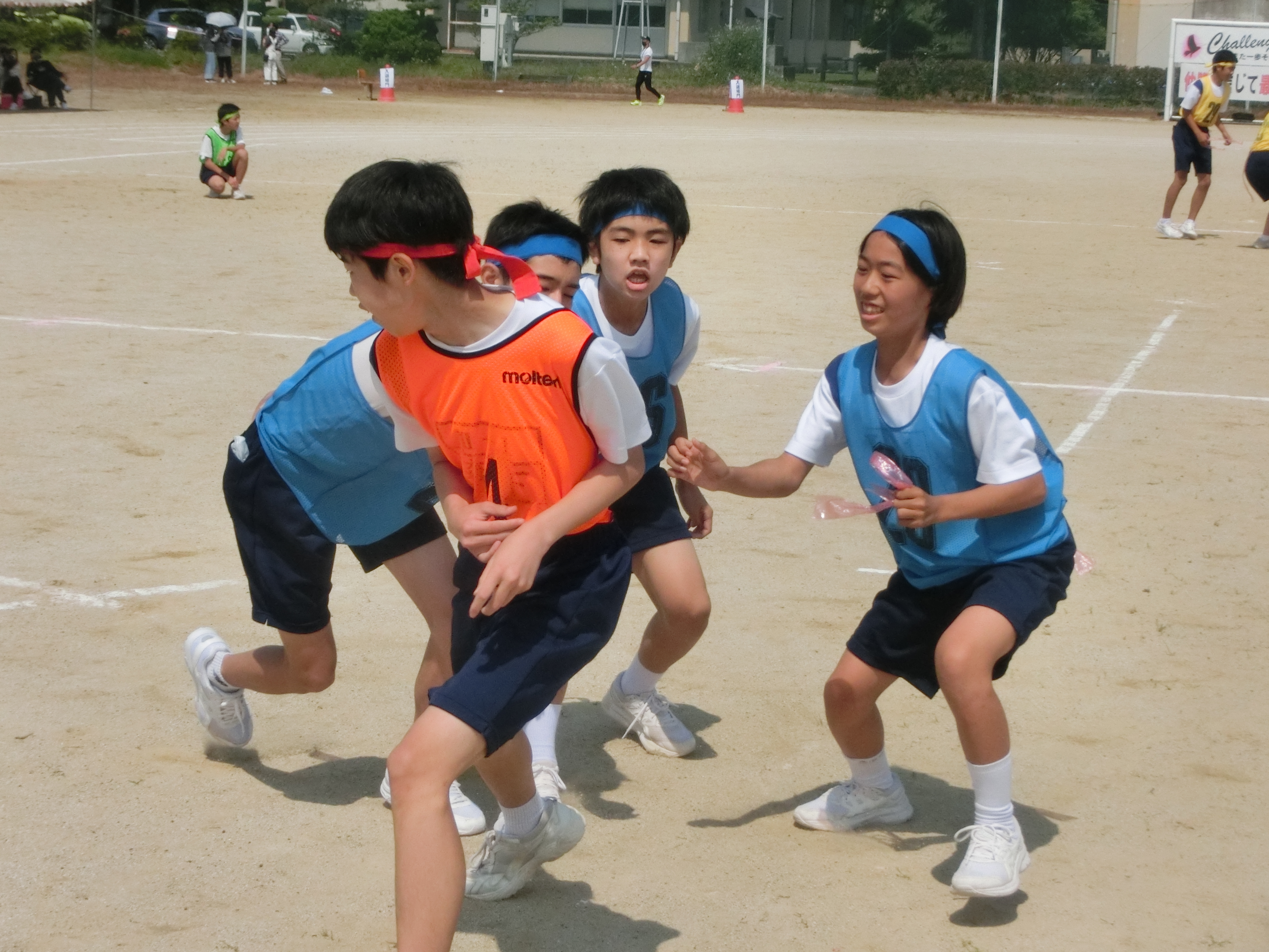 中学校は、紅団、白団、黄団、青団、緑団の5団に分け、3年生の男子5名すべてが団長となって各団5名の団員を引っ張りました。団対抗競技、「逃げろ! 奪え! 守れ! ~隠密作戦~」「日奈久トライアスロン」はチームワークが試される競技でしたが、最初は息が合わなかった団員たちも、本番ではすばらしいチームワークを見せてくれました。まさに中学校サブテーマの「仲間を信じて最後まで」を生徒全員が意識して取り組んだ結果でした。3年生のリーダーシップのおかげで、各々が自分の可能性にチャレンジでき、成長を実感できた運動会となりました。