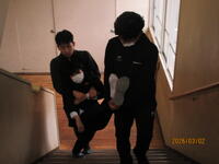 ハザードマップによると、日奈久中学校に到達する津波の高さは5~10メートルということなので、三階に垂直避難しました。また、けがで動けない生徒がいるという状況も設定し、けが人を避難させる搬送訓練も行っています。