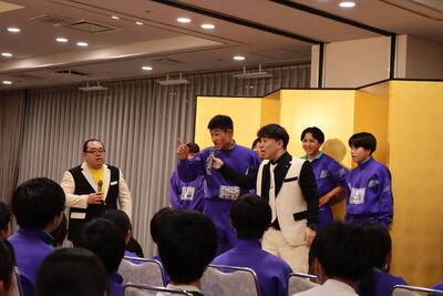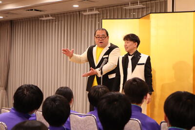 夕食後は「お笑いライブ体験」ということで、大阪から人気お笑い芸人「ともだち」さんを講師にお迎えし、さすがプロ!という軽快なお話に引き込まれ、とても楽しい時間となりました。