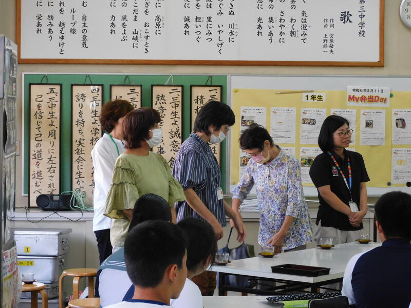 1年生が家庭科の学習で「調理実習」を行いました。市給食センターより瓜生先生に来ていただき、「つぼん汁」と「なます」の作り方をご指導いただきました。家庭でもぜひ実践してほしいと思います。