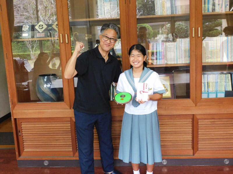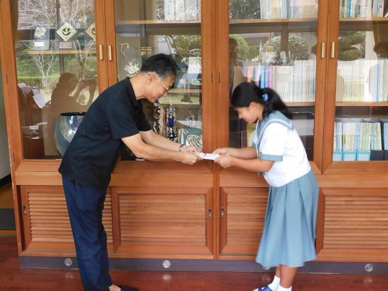 10月18日(金)~20日(日)に、三重県伊勢市で開催される「ジュニアカップU16陸上競技大会」に出場する生徒へ、人吉市PTA連絡協議会様より奨励金を交付していただきました。市P連から永田会長他3名の役員さんにご来校いただき、永田会長から激励の言葉もいただきました。市P連の皆様ありがとうございました。