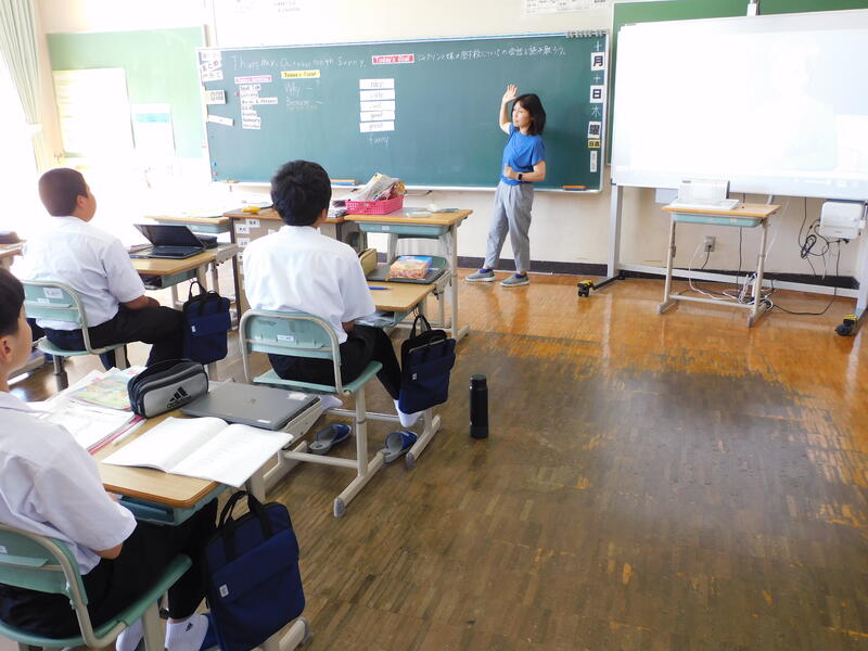 英語は江原先生とALTで授業を行います。今年度のALTはゲイジ・ストーク先生です。今年度から人吉市の小中学校でALTとして英語の授業をされます。本日は1年生の英語の授業で自己紹介などありました。ゲイジ先生との学習が大変楽しみです。