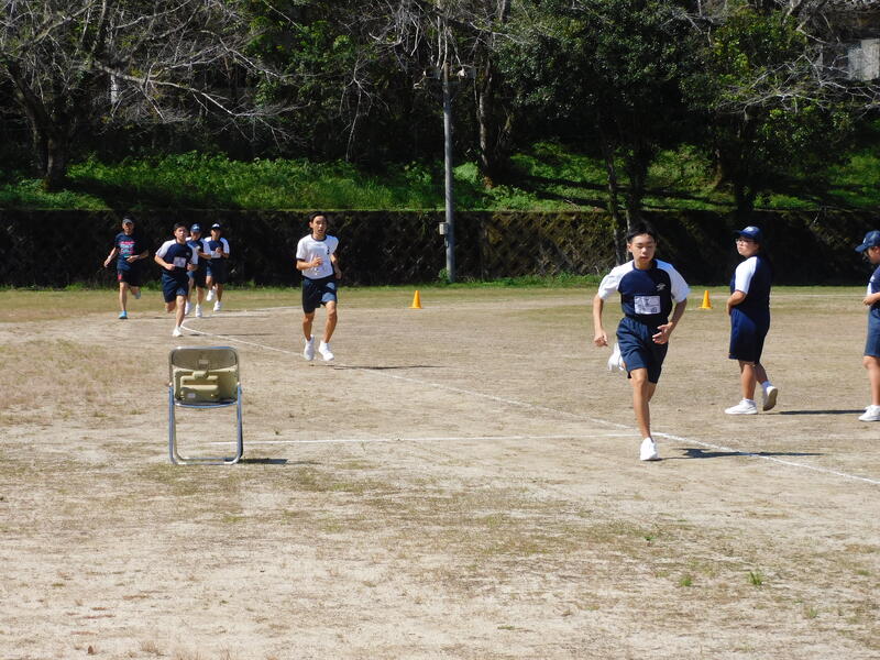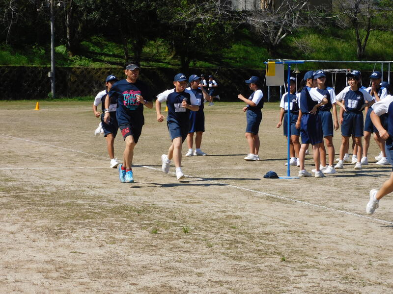 1~3年「合同体育」です。男子1500メートル走、女子1000メートル走では、昨日の疲れを感じさせない走りでした。担当の一鬼先生も走っていました。