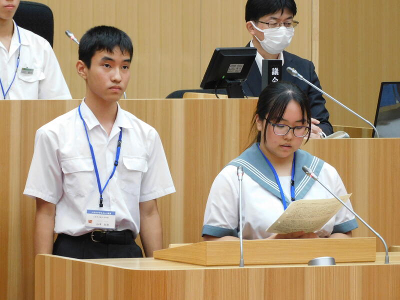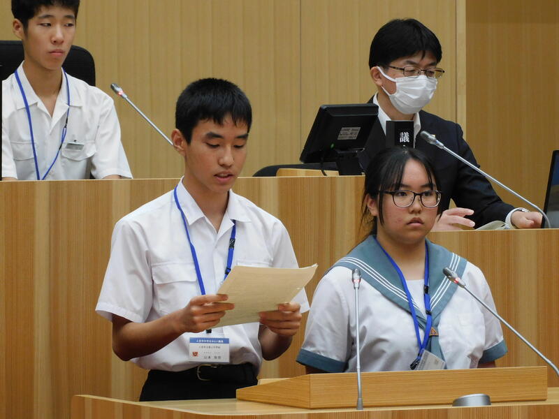 令和6年度「人吉市中学生みらい議会」が人吉市役所4階議場にて開催されました。市内3中学校の代表生徒が各テーマに沿って提案及び質問をしました。本校からは2名の生徒が出席し、「人吉市の街づくり」について、調査をもとに提案及び質問をしました。市長、教育長、各部長から丁寧に答弁いただき、生徒にとって大変貴重な経験となりました。