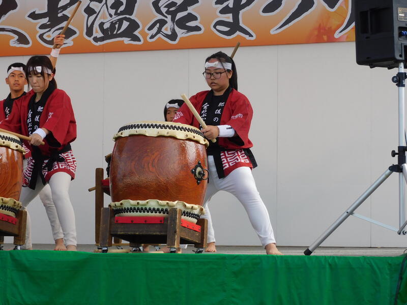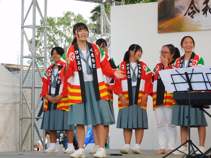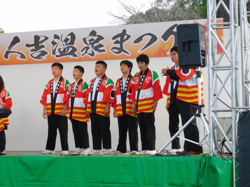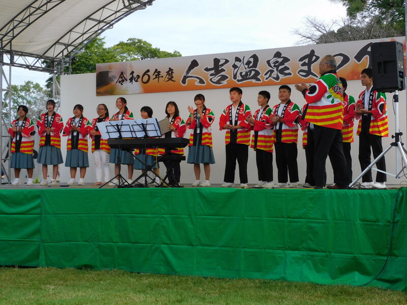 人吉城跡ふるさと歴史の広場で開催された「ひとよし温泉祭り」のステージの部に参加し、3曲の合唱を披露しました。日曜日の開催で、全員揃っての発表とはいきませんでしたが、少人数ながらすばらしいパフォーマンスを披露してくれました。聴衆の皆さんからたくさんの拍手をいただきました。