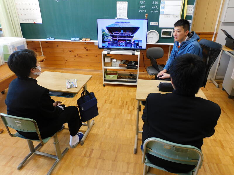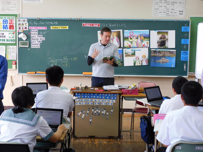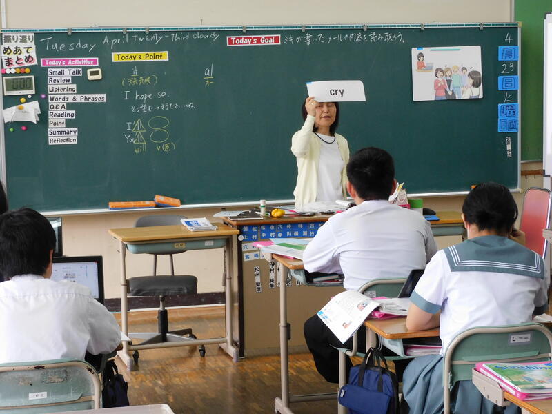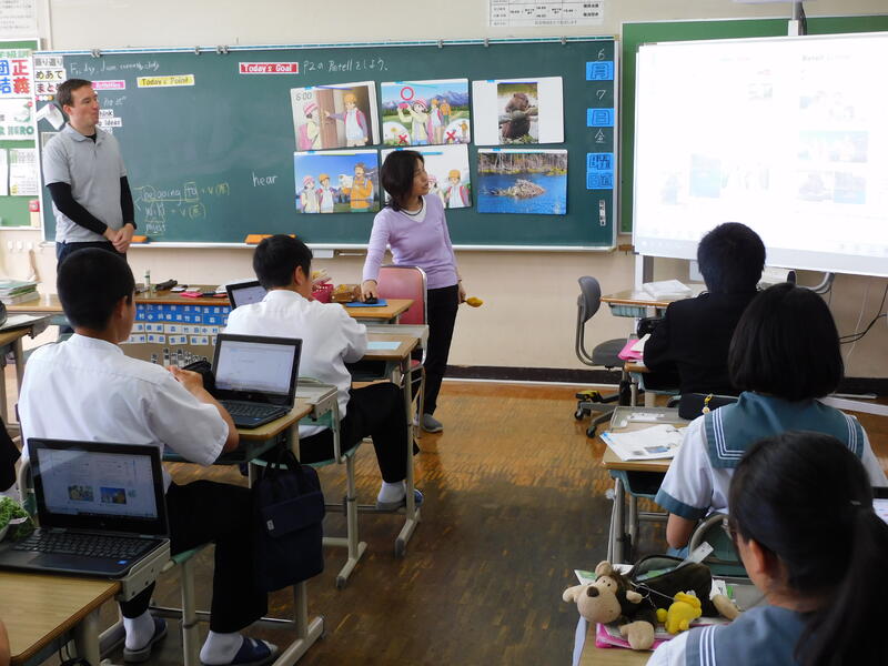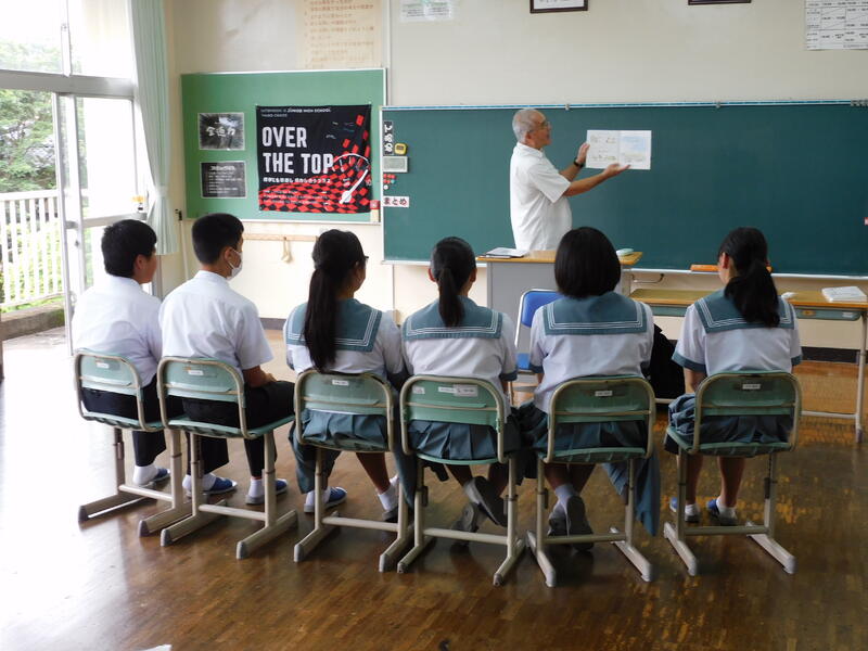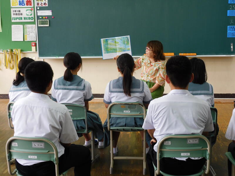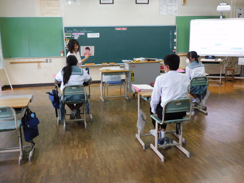 人吉市より星野TAEとコウディーALTに定期的に来ていただき、英語の学習について、折戸先生と一緒に授業をし、授業へのアドバイスをしていただきます。生徒たちも楽しみながらも真剣に授業に取り組んでいます。
