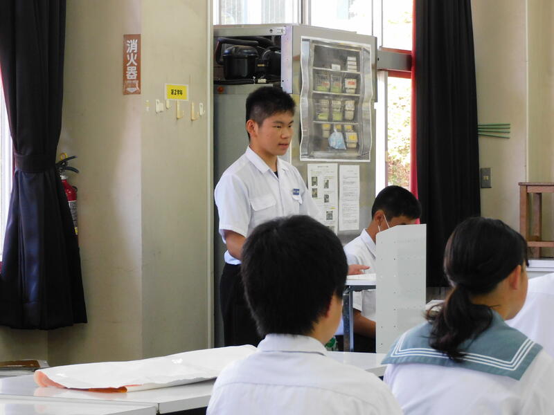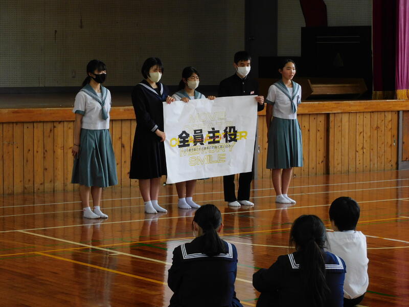 対面式では、新入生と先生方の自己紹介、部活動紹介を行いました。新入生はやや緊張気味でしたが、先生方は自分の趣味や余暇の過ごし方など話をしました。部活動紹介では、3つの部活動(女子バスケットボール部、ソフトテニス部、陸上競技部)が趣向を凝らした楽しい発表をしていました。