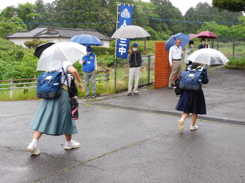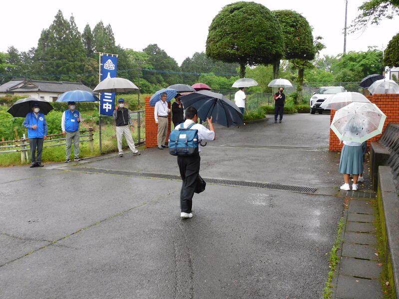 今年度一回目の「あいさつ運動」を実施しました。地域学校協働活動の一環で登録していただいているボランティアの方々、PTA役員の方々、生徒会執行部の生徒及び教職員で校門前で実施しました。あいにくの雨模様でしたが、多くの方々にご協力いただき実施することができました。今後も本校へのご支援をよろしくお願いします。