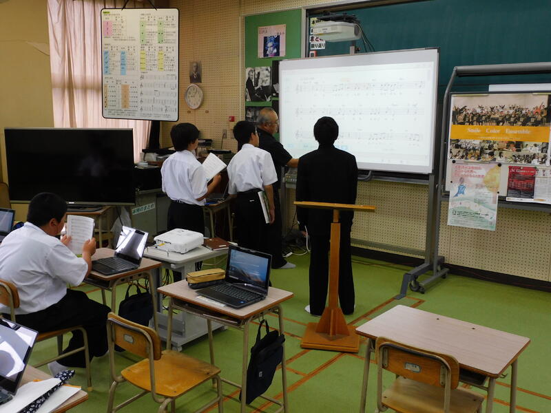1年「音楽」の授業の様子です。タブレットや電子黒板を使って曲の音程をつかんでいきます。村田先生の指導のもと、休符の間の取り方に気をつけながら練習をしていました。
