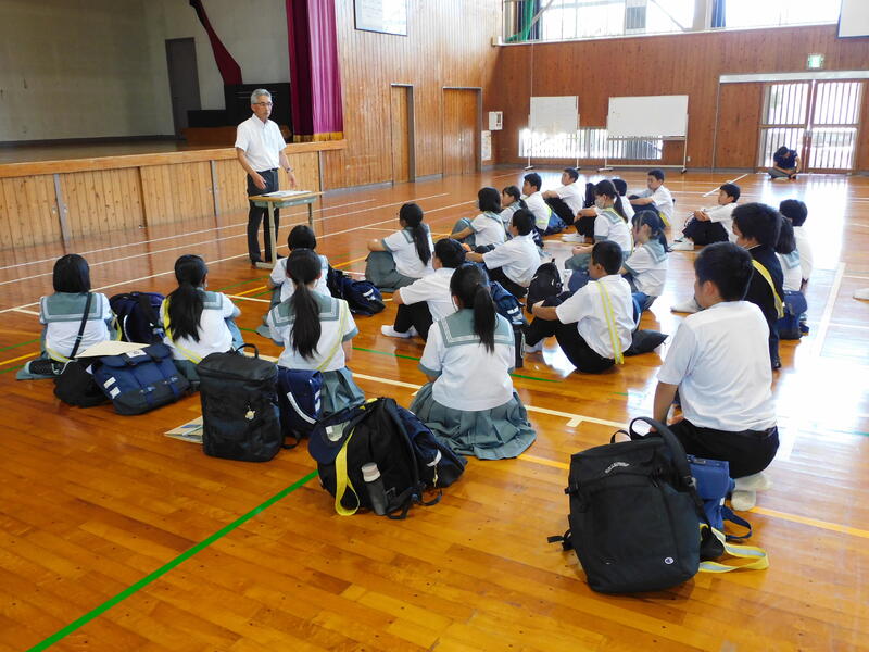 今年度就任した米(よね)校長は、言葉を大切にすること、読書を好きになってほしいと話をしました。校歌斉唱の後、生徒指導担当、養護教諭から学校での生活に関わる話がありました。