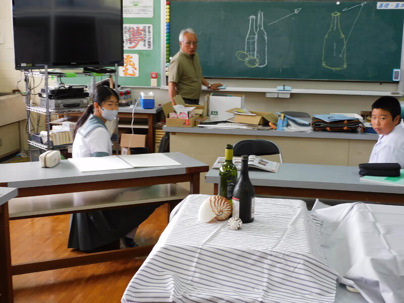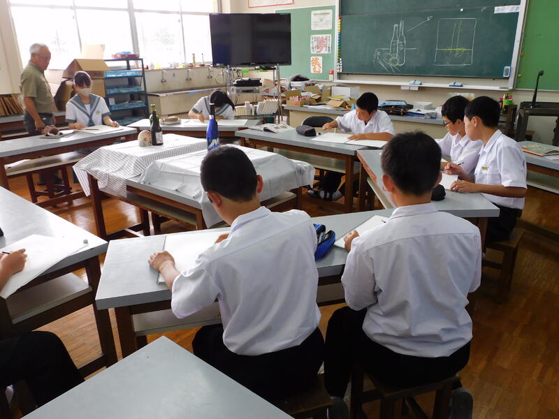 1年「美術」の授業の様子です。「静物を描く」学習でした。美術担当松本先生の説明を聞き、構図を考えていきます。ビンとビンの重なりをどう表現すればいいか難しかったようですが真剣に鉛筆をはしらせていました。完成が楽しみです。