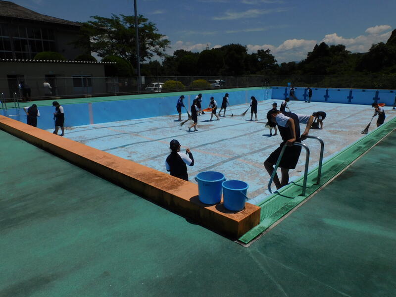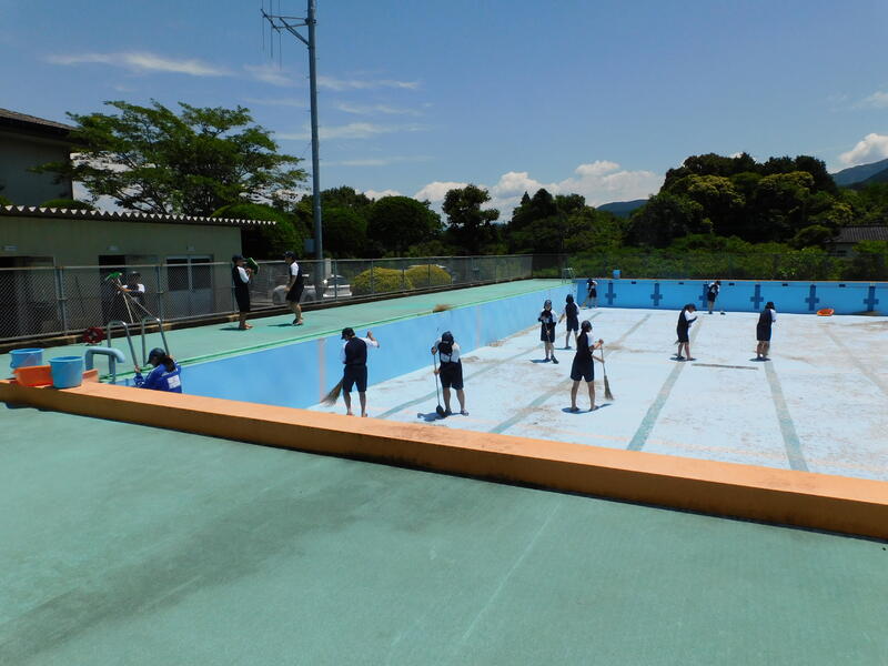 3・4校時に全校生徒でプール掃除を行いました。あらかじめ水抜きをしたプールに入り、掃き掃除、水洗いをしました。水泳学習に向け準備を進め、来週は水入れを行う予定です。