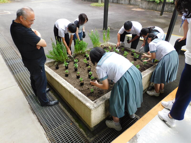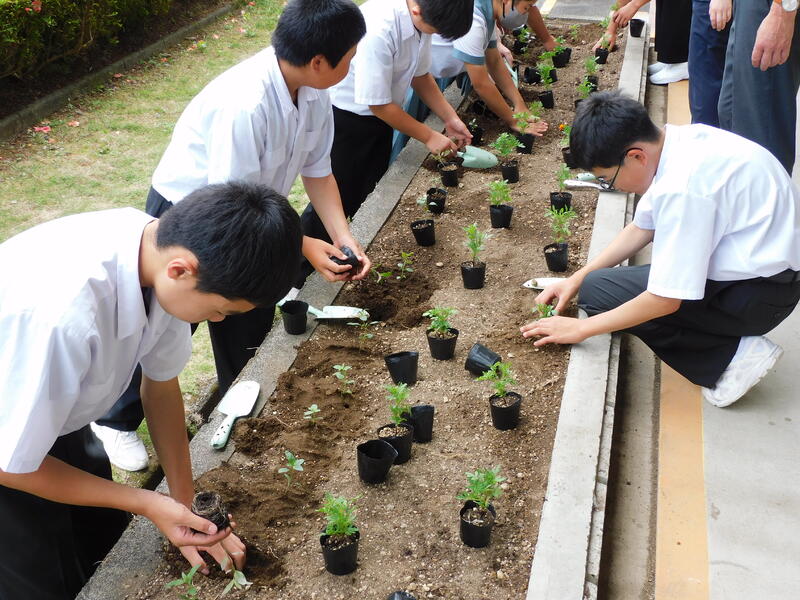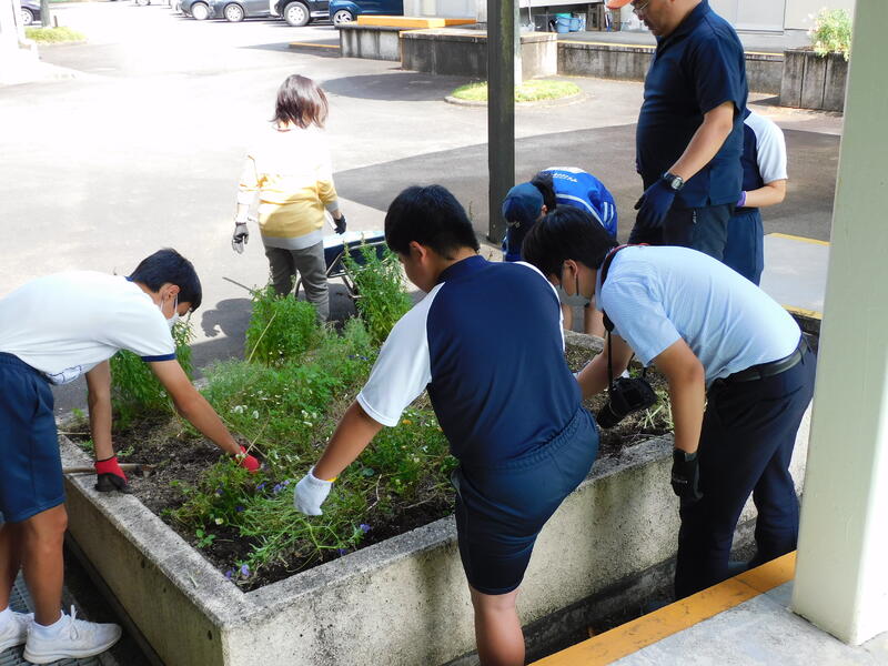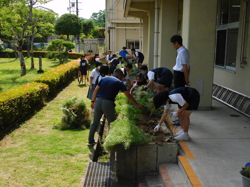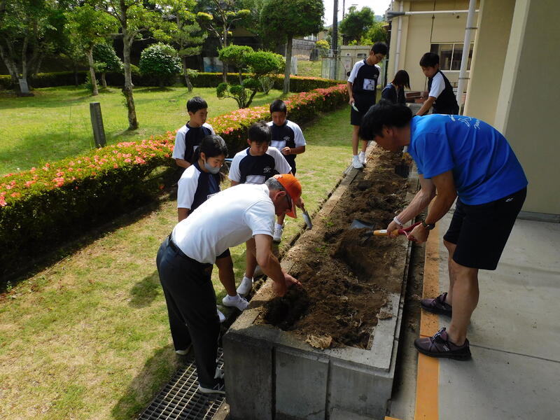 全校生徒で「母校磨き活動①」として、花壇の整理を行いました。各学年ごとに割り当てられた場所で、草花を向き、肥料をまいて整地しました。次回の「母校磨き活動②」は、6/12(水)で、苗を植える予定です。