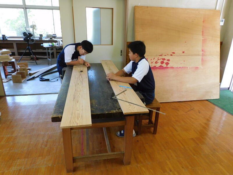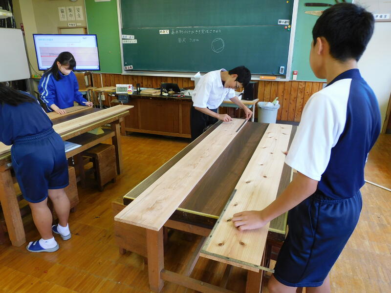 1年「技術」の授業の様子です。「さしがね」を使って寸法を測り、線を引いていきます。直角の部分の使い方がポイントのようです。