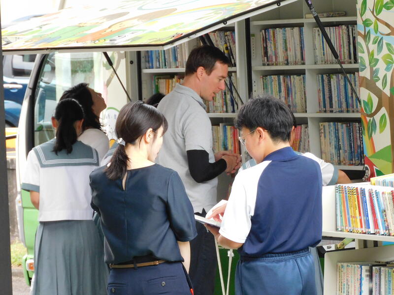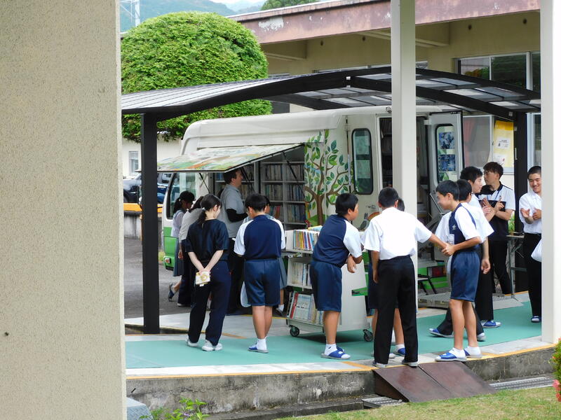 定期的に市図書館から移動図書が来られます。本好きの生徒たちが思い思いに本を選んでいます。いろいろなジャンルの本に触れ、読書を楽しんでほしいと思います。