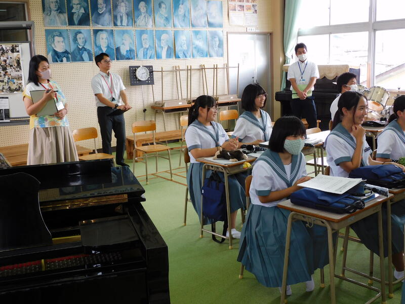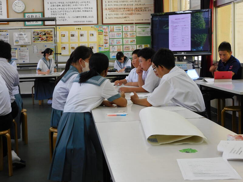 大畑校区では、園・小・中が連携し、子どもたちの健全な育成を目的として、年間3回の合同研修会を実施します。第1回目は、本校が会場となり、多くの先生方に来ていただきました。1年「英語」、2年「音楽」、3年「数学」の授業を参観していただき、その後、情報交換を行いました。グループでの情報交換では、活発な意見交換がありました。