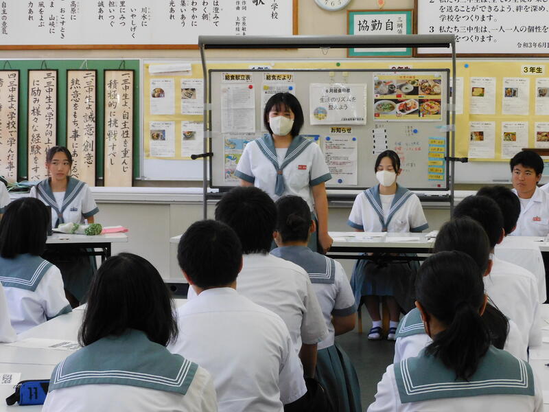 本日は、1学期さいごの「給食」でした。給食センターから栄養教諭の瓜生先生に来ていただき、「食」についてお話をしていただきました。「食べること」は、人間が活動する源になるものです。1学期間、おいしい給食ありがとうございました、給食センターの皆様へ感謝です。