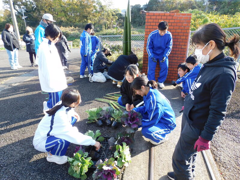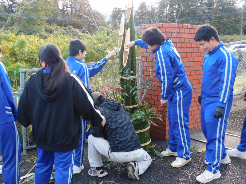 PTA主催の「門松作り」を行いました。まず、朝8:00に大畑小へ集合し、昨日切り出した竹や熊笹を準備し、第三中に移動しました。竹に油を塗り、葉牡丹や梅、松をバランス良く配置し、素敵な門松ができあがりました。良い年を迎えることができそうです。参加していただいた保護者の皆様、ありがとうございました。