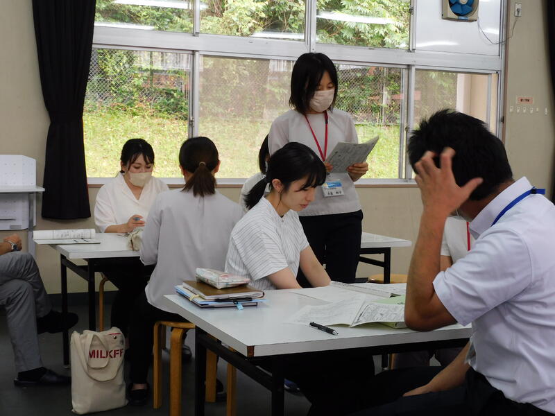 大畑校区では、園・小・中が連携し、子どもたちの健全な育成を目的として、年間3回の合同研修会を実施します。第1回目は、本校が会場となり、多くの先生方に来ていただきました。1年「英語」、2年「音楽」、3年「数学」の授業を参観していただき、その後、情報交換を行いました。グループでの情報交換では、活発な意見交換がありました。