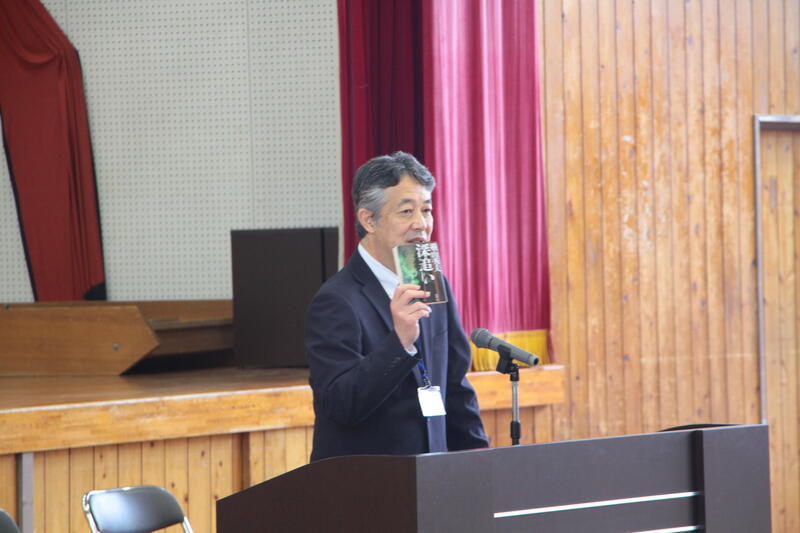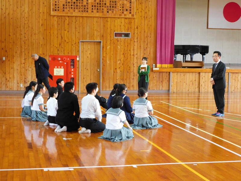 今年度就任した米(よね)校長は、言葉を大切にすること、読書を好きになってほしいと話をしました。校歌斉唱の後、生徒指導担当、養護教諭から学校での生活に関わる話がありました。