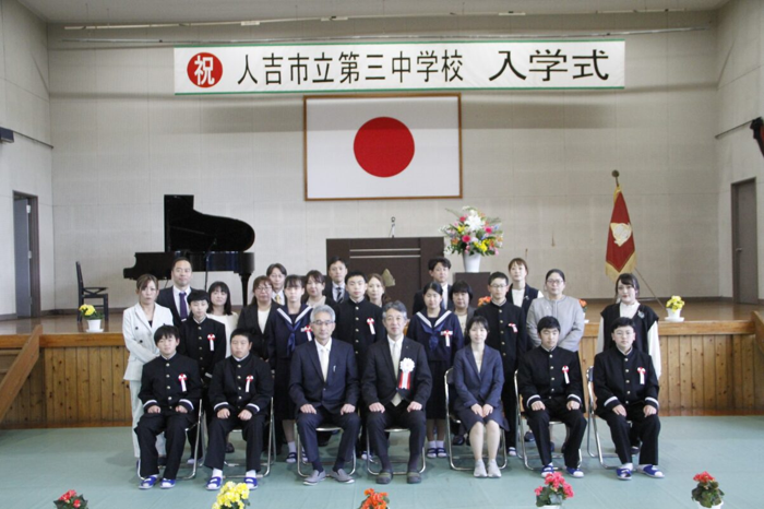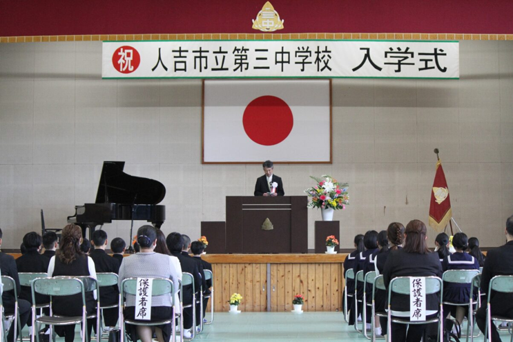永田勝巳人吉市総務部長他多くの来賓の皆様、志波人吉市教育長にご臨席いただき、14:00より第74回人吉市立第三中学校入学式を挙行しました。今年度入学した9名の新入生に対し、4月に就任した米校長は、「リスペクト アザース(他者を尊重する)気持ちを大切にしてほしい」と式辞を述べました。来賓を代表し2名の方から祝辞をいただき、厳かな雰囲気の中、式を終えることができました。在校生からの歓迎の言葉、新入生の誓いの言葉も大変立派でした。早く中学校生活に慣れて有意義な学校生活を送ってほしいと思います。