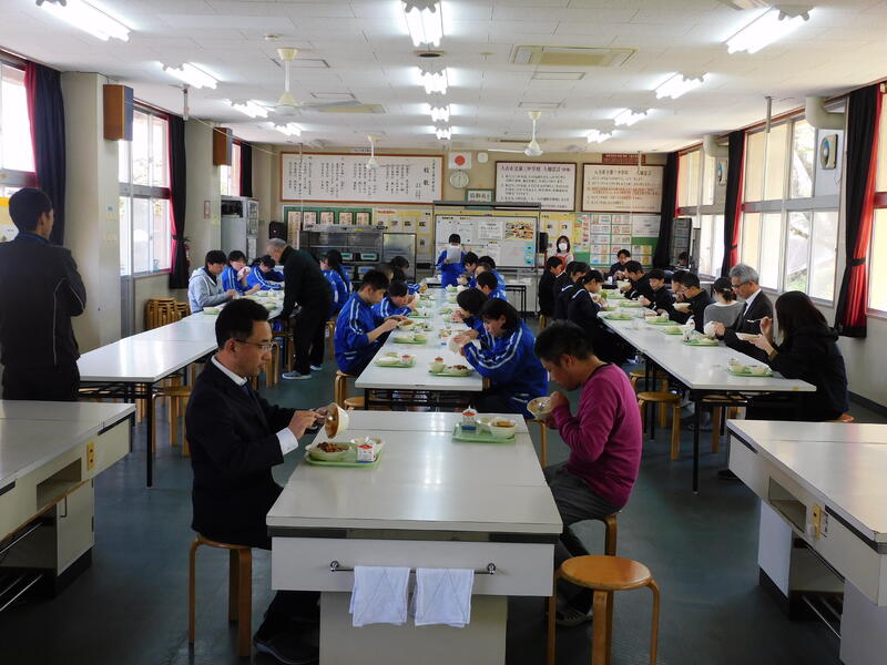 本日が本年度初めての給食となりました。本校はランチルームで全生徒一緒に給食を食べます。さすが2・3年生は手際よく準備をしていました。1年生は少々準備に手間取っていましたが、上級生に教えてもらいながら準備をしていました。給食センターの皆さんに感謝し、今年度も1年間美味しい給食いただきます。