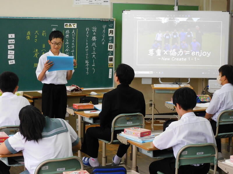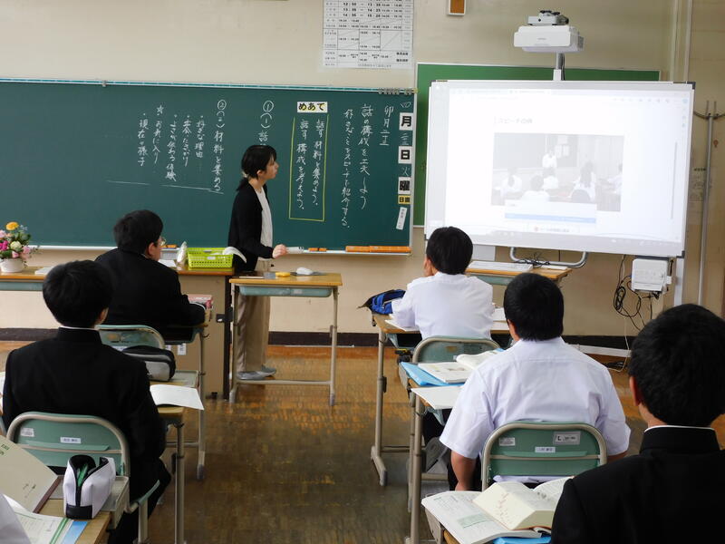 1年「国語」の授業の様子です。担当は馬場先生です。自分の好きなことをスピーチで紹介する学習です。生徒は動画で手本となるスピーチを視聴し、スピーチの構成などポイントを確認していました。