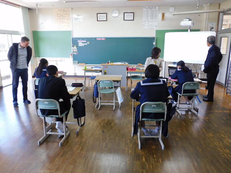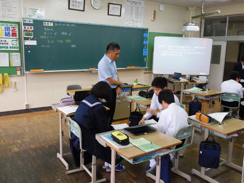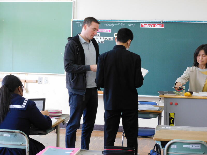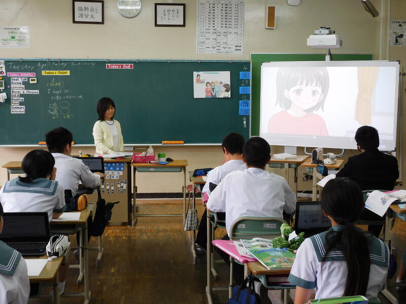 人吉市より星野TAEとコウディーALTに定期的に来ていただき、英語の学習について、折戸先生と一緒に授業をし、授業へのアドバイスをしていただきます。生徒たちも楽しみながらも真剣に授業に取り組んでいます。