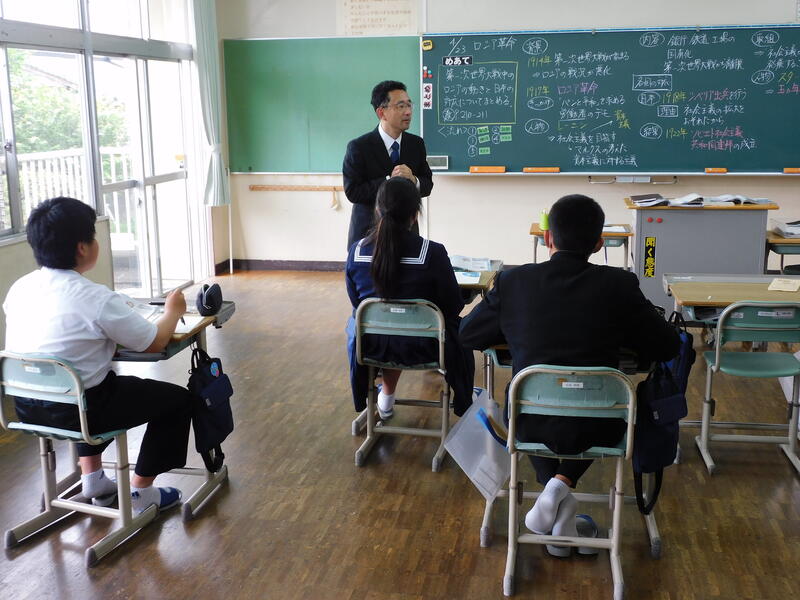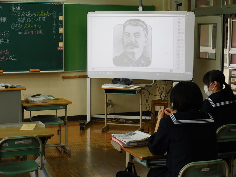 3年「社会」の授業の様子です。担当は村上先生です。スターリンのロシア革命についての学習でした。スターリンの「5カ年計画」について、日用品を例にして説明がありました。生徒からは日本では「あり得ない」「信じられない」と驚きの声があがっていました。