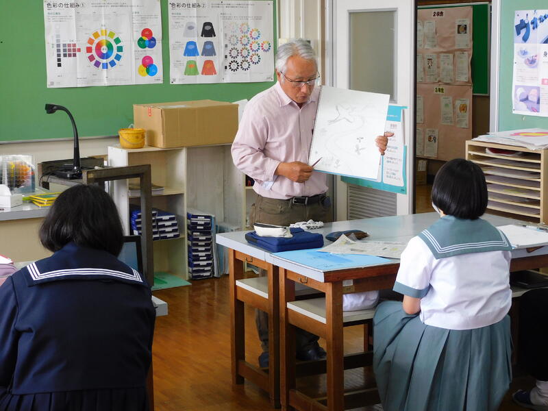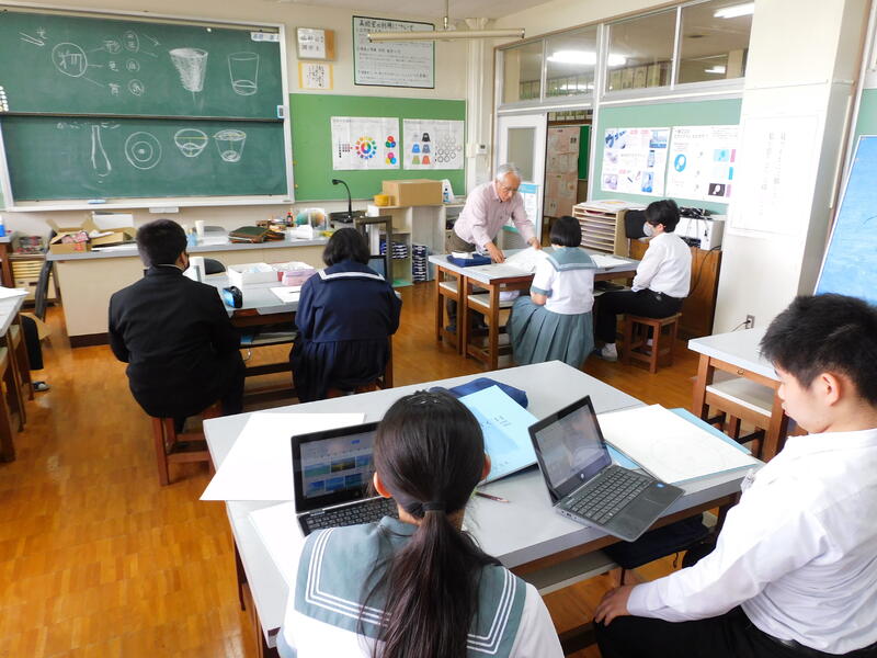 2年「美術」の授業の様子です。今年度も「美術」は、非常勤で松本正運先生が授業を行います。「環境保全」についてポスター製作の学習です。地球温暖化等への対策をアピールするためレイアウトを工夫していました。完成が楽しみです。