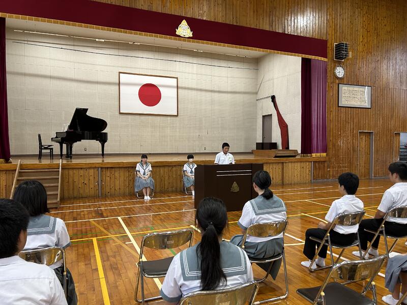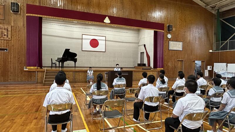体育館にて2学期始業式を行いました。始めに各学年の代表生徒が、夏休みの振り返りと2学期の抱負を発表しました。続いて米校長は、「夢や目標に大小はない、人に強要されるのではなく、自分の心から湧き出してくるような夢や目標を立ててほしい。」と話をしました。いよいよ2学期のスタートです。すべての生徒が幸せな学校生活が送れるようしっかりサポートしていきます。