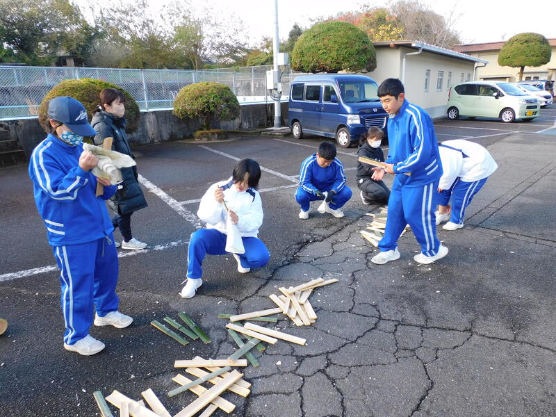 PTA主催の「門松作り」を行いました。まず、朝8:00に大畑小へ集合し、昨日切り出した竹や熊笹を準備し、第三中に移動しました。竹に油を塗り、葉牡丹や梅、松をバランス良く配置し、素敵な門松ができあがりました。良い年を迎えることができそうです。参加していただいた保護者の皆様、ありがとうございました。