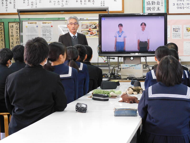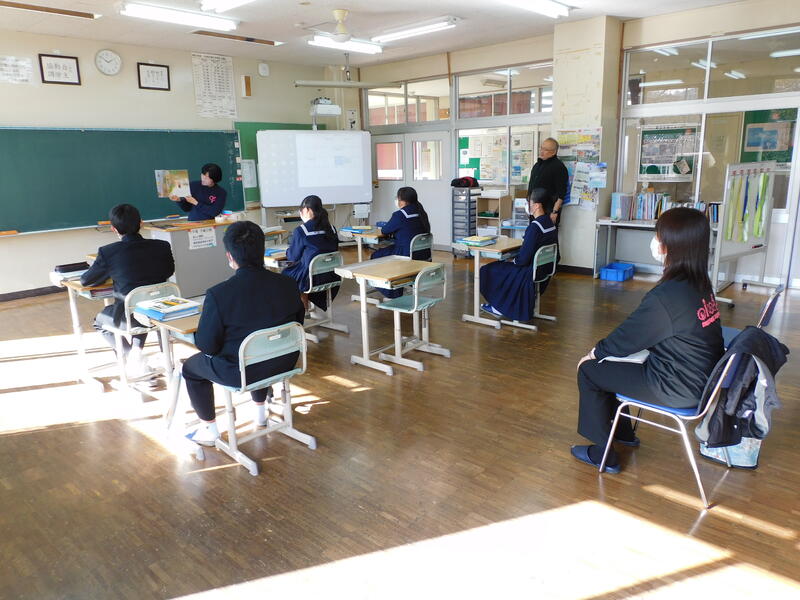 3年生は、家庭科の学習の一環で、「保育体験」を行います。20日(金)に、おこばこども園を訪問させていただき、「保育実習」を行います。その事前指導として、おこばこども園から2名の先生に来ていただき、読み聞かせのやり方など指導していただきました。