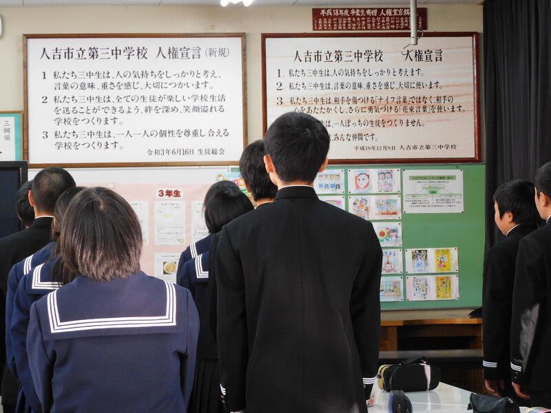 「世界人権デー」に合わせ、本校でも「人権集会」を実施しました。集会の目的について、西先生から説明があった後、「熊本県人権子ども集会」の様子をオンデマンドで視聴しました。生徒一人一人が人権について考える良い機会になったと思います。